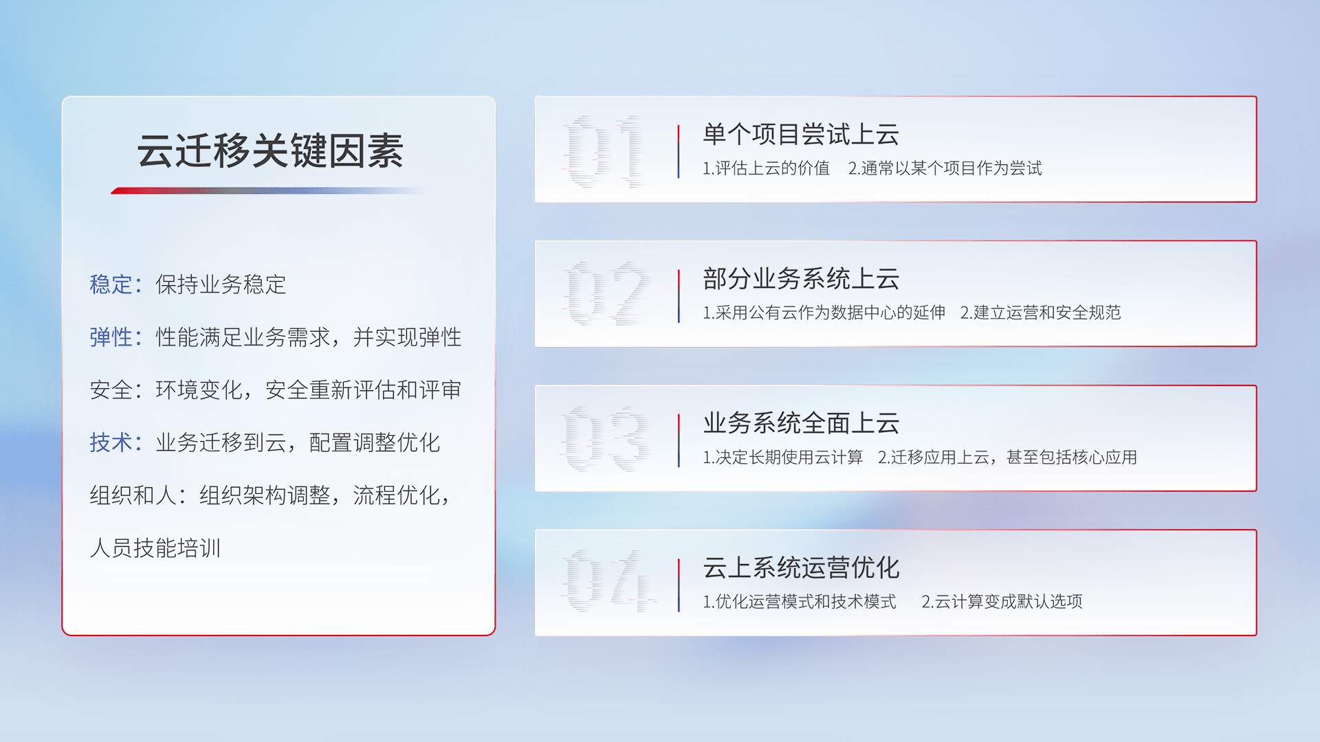 结合实际业务,,,从规划设计、、云平台选型、、、云原生改造、、、、数据迁移、、集成交付,,,,迁移全过程为客户识别最佳上云路径,,,做好风险识别管理,,,,设计网络架构、、身份权限、、、、安全审计合规、、、操作审计、、日志审计、、监控告警策略、、多站点容灾设计等,,,,对云上基础设施进行整体规划,,,提升IT治理水平,,,,以满足弹性、、、、高可用、、高性能的需求。。。。