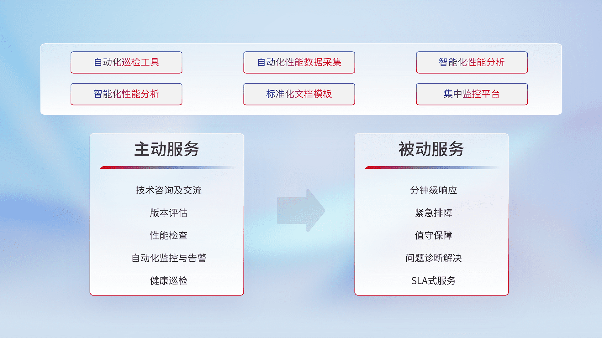 智能化工具和标准化文档,,,,保障服务质量,,,,提供主动服务(包含技术咨询、、、版本评估、、性能检查、、、自动化监控与告警、、、、健康巡检)和被动服务包含(分钟级响应、、、、紧急排障、、、、值守保障、、、问题诊断解决、、、SLA服务)。。