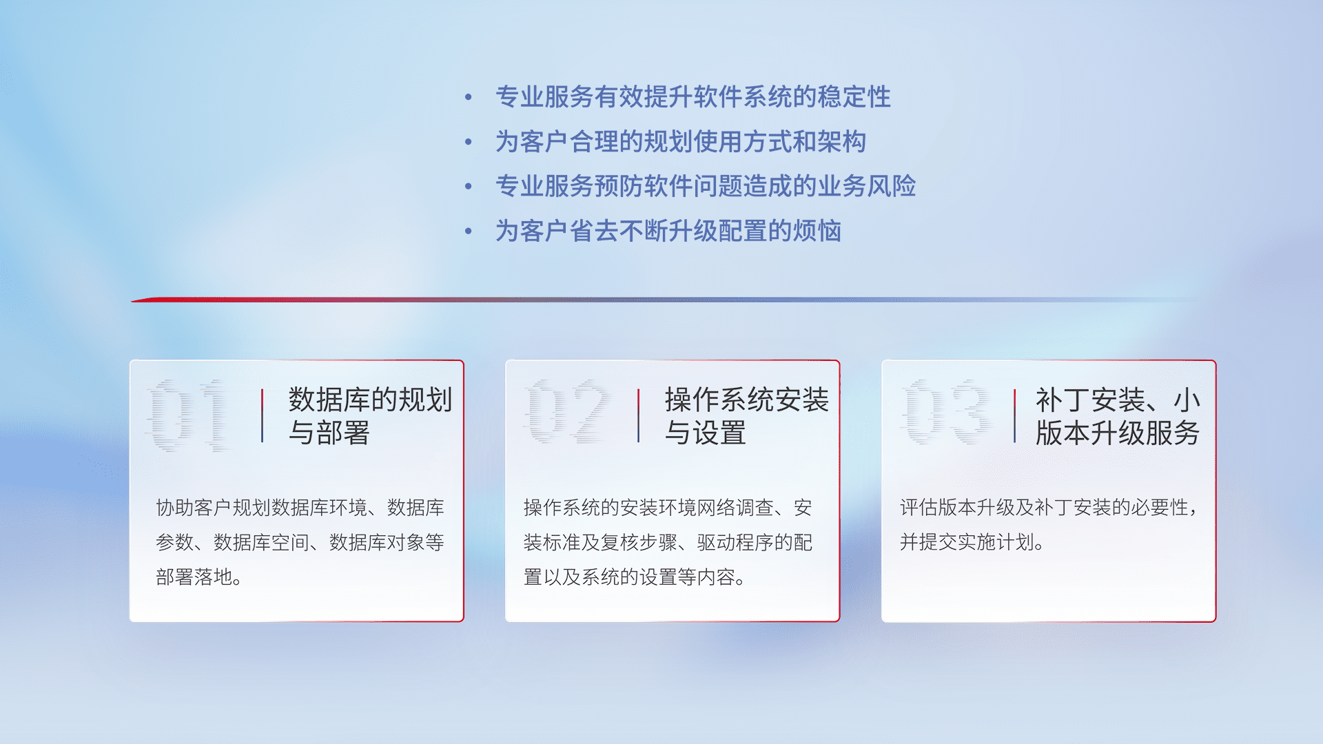 为客户提供软件规模升级、、、快速部署、、、按需配置的专业服务,,,从数据库的规划与部署到操作系统的安装与设置,,,,再到补丁安装和小版本升级提供支持。。。。